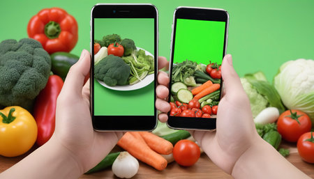 fresh vegetables and holding mart phone with green screen on table