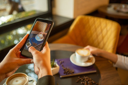 Female hand with smartphone take photo in coffee shop