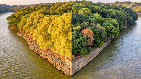 Aerial view of an island split between autumn and summer, showcasing vibrant yellow and green foliage.