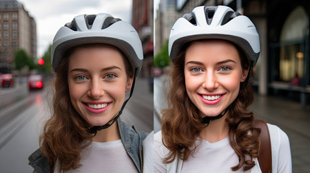 a young, pretty girl wearing a bicycle helmet, emphasizing her friendly and approachable demeanor as she smiles, embodying the bicycle concept effortlessly