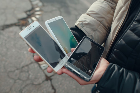 Man comparing three smartphones, deciding on new purchase or recycling old phones