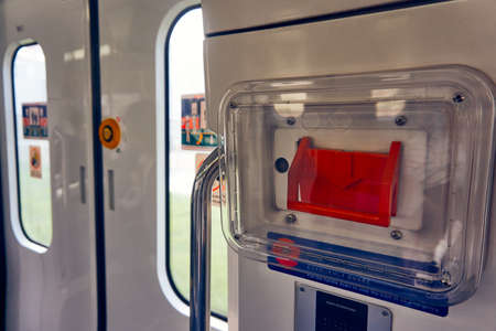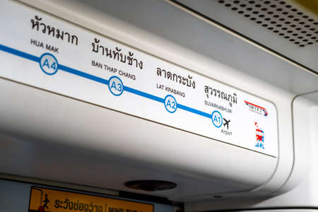 Bangkok, Thailand - 11 Apr 2020: Bangkok Airport Rail Link (ARL) information over the passenger door inside the train to Suvarnabhumi Airport station. Bangkok, Thailand.