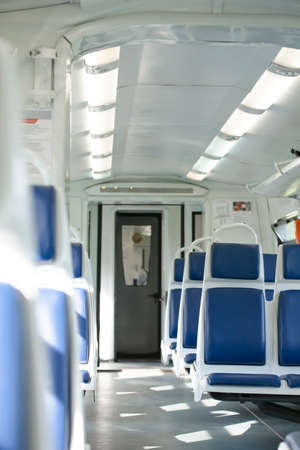 Train carriage with blue seats. An empty wagon of an electric bus. Train.
