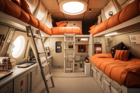 Compact capsule hotel room interior, small bedroom design in hostel accommodation