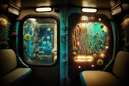 bus cabin, with bacteria and other microorganisms visible under the microscope, created with generative ai