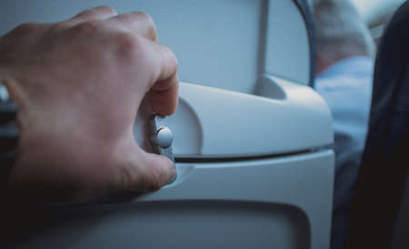 Man opening knob for releasing table tray on an aeroplane seat backrest. Visible tray in stowed position with a hand of a person turning the knob.