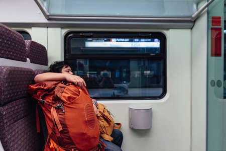 Tourist man or student with a backpack waiting for the train to stop to go outside.
