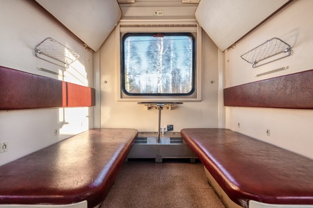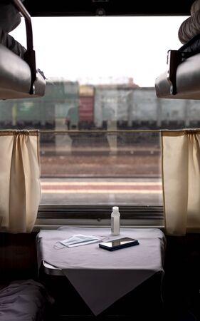 Interior of a long-distance train in Russia. Window in the train compartment. Sanitizer, mask and phone on the table During the coronovirus pandemic COVID 19