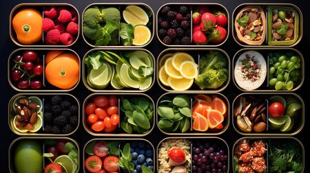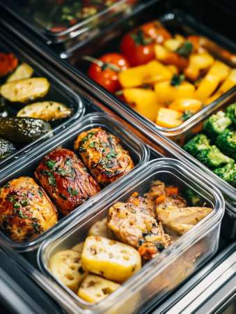 Colorful variety of healthy meal prep boxes with roasted vegetables and grains.
