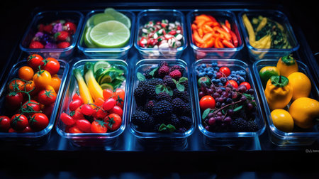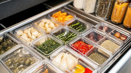 This image showcases a well-organized kitchen drawer filled with an array of fresh ingredients, including herbs and spices, all stored in clear containers for easy access while cooking.