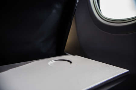 Airplane Seat Tray Open Empty Food Waiting. Inside the cabin of a Boeing. Seats in economy class.