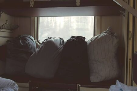 Bags of dirty linen on the train on the bottom shelf in a second-class carriage