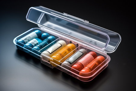 Plastic containers for storage and everyday use of tablets, pill boxes with colorful pills