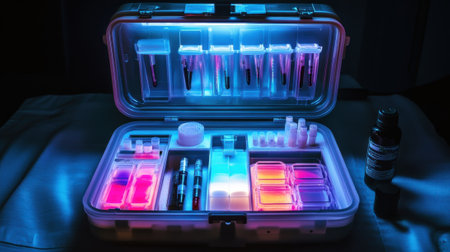 A closeup of an open diagnostic kit displaying organized compartments filled with testing reagents and sampling tools designed for easy access and efficiency highlighting the functionalit