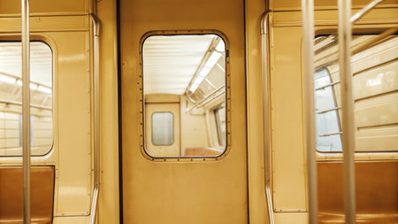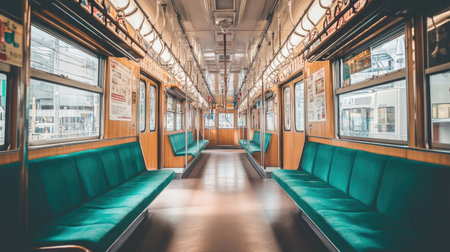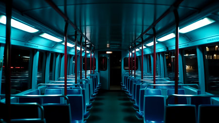 Empty subway car. Interior of the metro train with seats. Generative AI illustration