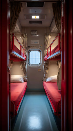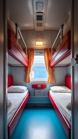 Interior shot of a train sleeper cabin featuring red-framed bunk beds with red sheets, neutral curtains, and a window, capturing the compact and cozy design of train travel.
