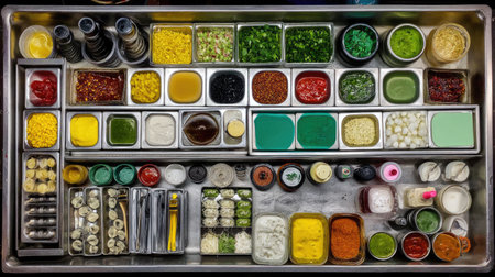 A visually striking arrangement of various cooking ingredients displayed on a metal tray, showcasing an assortment of spices, sauces, and fresh produce for culinary preparation.
