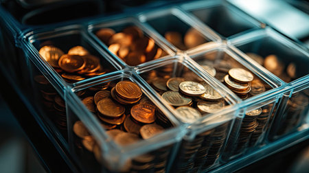 This image features an organized display of coins in clear storage containers, highlighting the texture and color of the currency while illustrating effective organizational methods for personal finance.