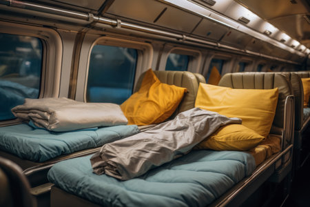 A quiet, empty electric train interior, showcasing comfortable seating and modern design elements, inviting viewers to imagine their next journey