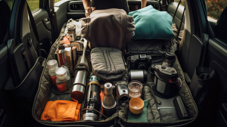 budget road trip planning illustration vehicle snacks, essentials packing, camera adventure budget road trip planning