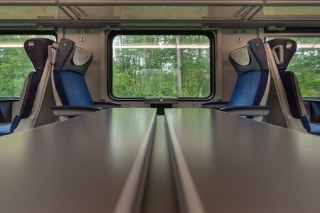 Inside The Wagon Train Germany, Dusseldorf. Empty train interior. interior view of corridor inside passenger trains with blue fabric seats of German railway train system.