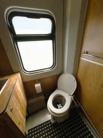 Toilet room with wash basin and mirror in fast expres train in cold winter day