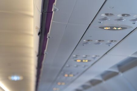 Fasten seat belt and no smoking signs in aircraft, overhead console of conditioner in a airplane. signs in the plane.