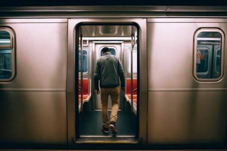 Passenger stepping into a subway car in the city, navigating the bustling platform as evening commuters embark on their journeys
