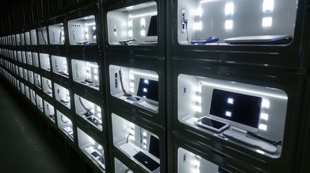 A stylish array of laptops and devices elegantly displayed in illuminated shelves, showcasing modern technology in a minimalist environment with bright LED lights.