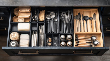 Discover a well-organized kitchen drawer showcasing various utensils, cutlery, and containers, reflecting a thoughtful design for cooking efficiency and home aesthetics.