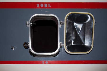 Vertical view of the metal opened automatic doors of a chromium-plated carriage trim of a European suburban train with a button for opening and dark bluish coach interior in the background