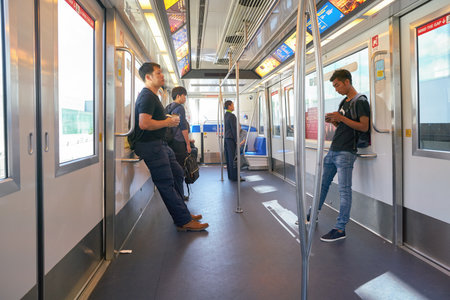 SINGAPORE - CIRCA APRIL, 2019: interior shot of Skytrain at Singapore Airport. The Changi Airport Skytrain is an automated people mover that connects Terminals 1, 2 and 3 at Singapore Changi Airport.
