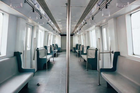 Interior of an empty metro carriage in Brussels, Belgium, selective focus.