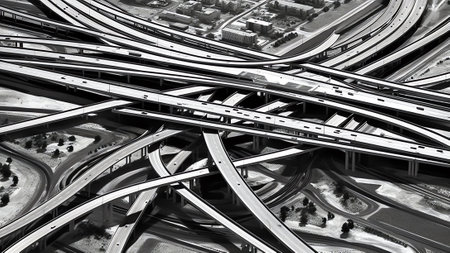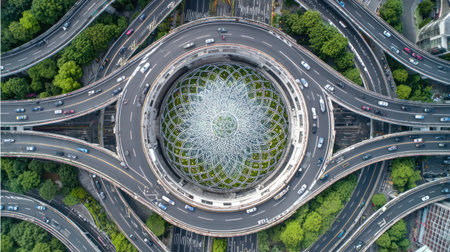 An overhead shot depicts a complex highway interchange with numerous curved roadways and overpasses. The scene showcases concrete structures, interspersed with green areas and buildings. The composition is symmetrical, featuring cars and trucks moving along the lanes, suggesting a busy urban environment. Suitable for editorial and commercial applications.