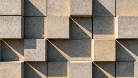 Rough speckled beige and light gray textured wall formed by cubic blocks, showcasing dramatic three dimensional depth due to intense directional lighting and striking angular shadows.