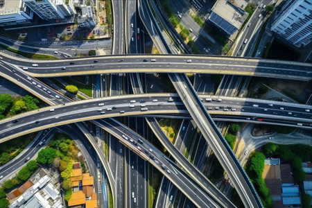 Generative AI Overhead views of a bustling freeway interchange connecting major highways and roads, capturing traffic flow.