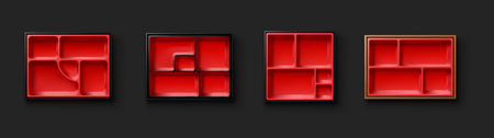 Collection of red bento boxes displayed against a dark backdrop. Showcases different compartment designs and styles. Ideal for showcasing packaging or culinary concepts.