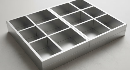 Modern silver grid design with twelve square compartments on white surface