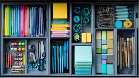 A well-organized drawer filled with vibrant stationery items and office supplies, promoting an inspiring and efficient workspace perfect for creativity and productivity.