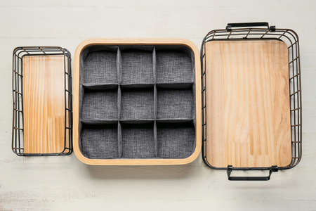 Empty wardrobe organizers on light wooden background