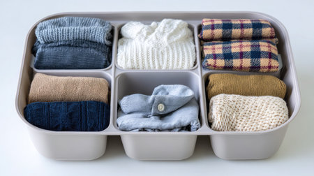 Young woman organizing underwear storage at bedroom. Contemporary folded container cases clothing