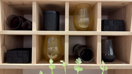 The beautiful features display a variety of elegantly arranged glasses and containers neatly placed on a wooden shelf