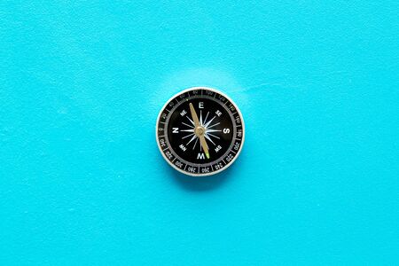 Modern nautical metal tourist compass on a blue background. travel or search concept