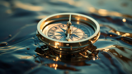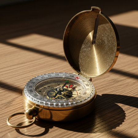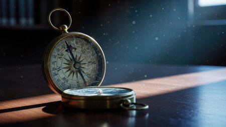 A close-up shot presents a classic brass compass atop a polished wooden surface. The scene is illuminated by warm sunlight, casting dramatic shadows and highlighting the intricate details of the compass. The image evokes a sense of exploration and navigation, suitable for various editorial and commercial applications.