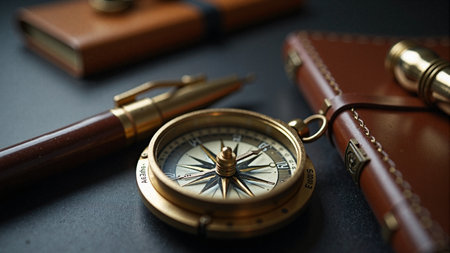 A classic brass compass rests upon a weathered, antique map, its needle pointing the way forward.