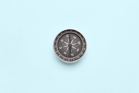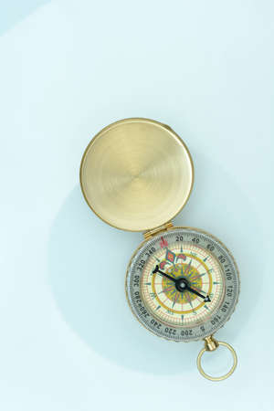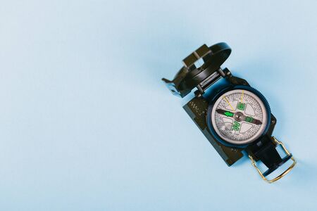 Tourist's compass on light blue background