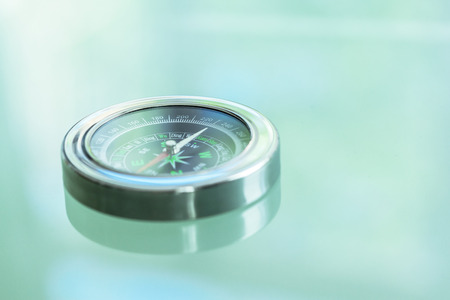 Close up shot of a silver metal compass always pointing it's needle towards North