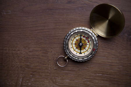 close up of compass on wooden background. High quality and resolution beautiful photo concept