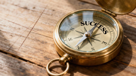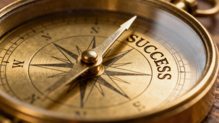 Extreme closeup of a circular golden navigation instrument resting on a rustic wooden table, illustrating a directional needle locked onto the critical phrase SUCCESS.