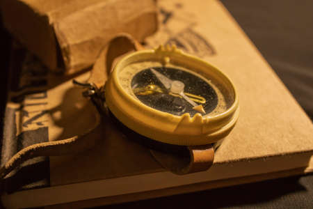 Compass with a leather strap in retro style on a book